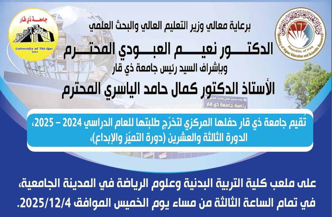 تُقيم جامعة ذي قار حفلها المركزي لتخرّج طلبتها للعام الدراسي 2024 – 2025.
