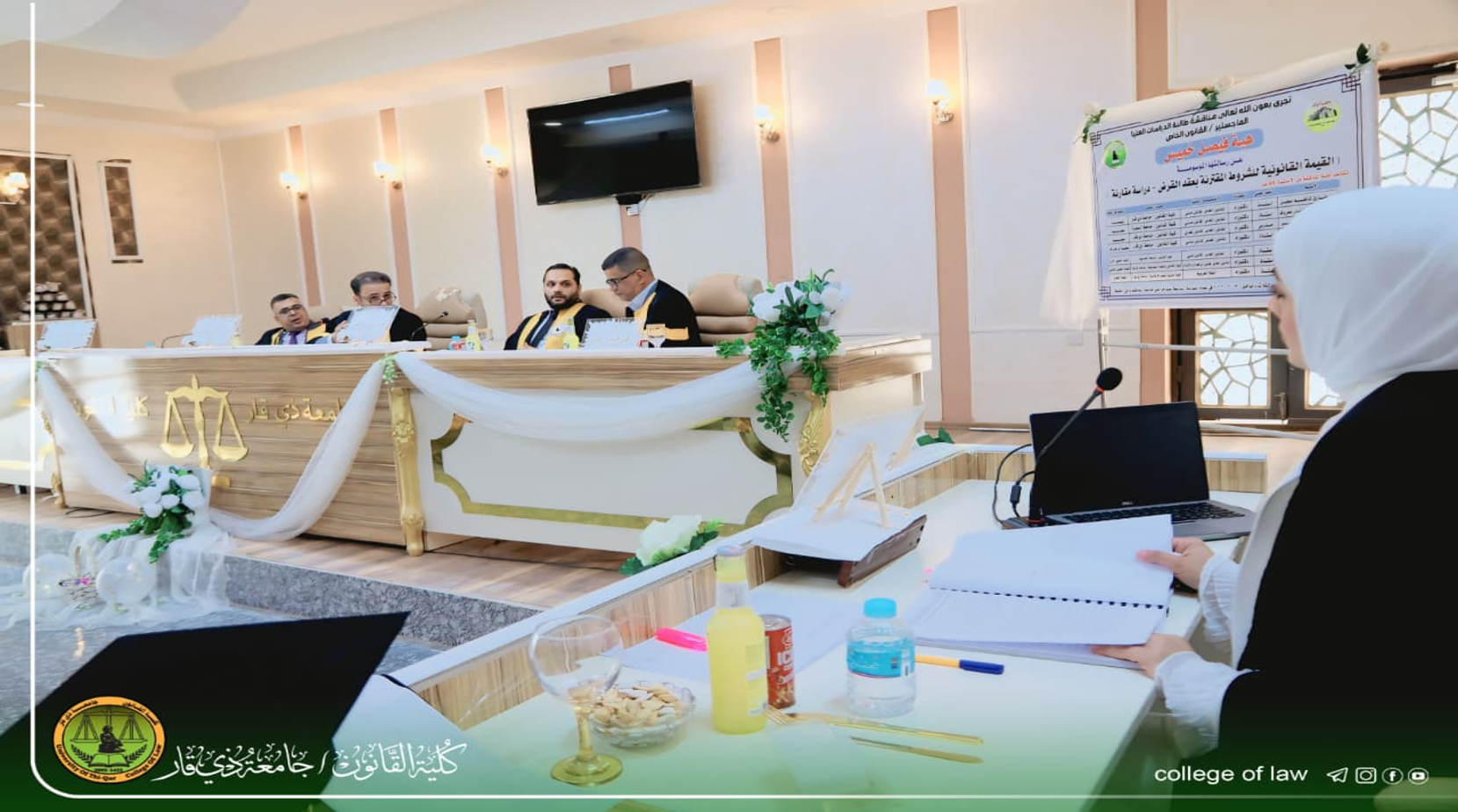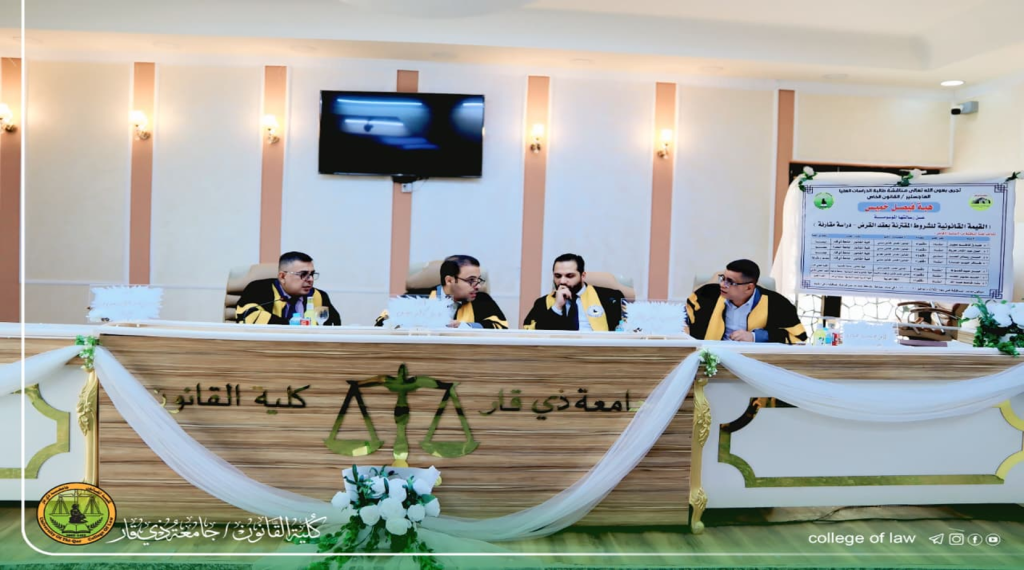 تمت في كلية القانون مناقشة رسالة ماجستير في قسم القانون الخاص لطالبة الدراسات العليا (هبه فيصل خميس)عن رسالتها الموسومة ب ( القيمة القانونية للشروط المقترنة بعقد القرض_ دراسة مقارنة) يوم الثلاثاء الموافق 2026/2/17 على قاعة المناقشات في الكلية،
