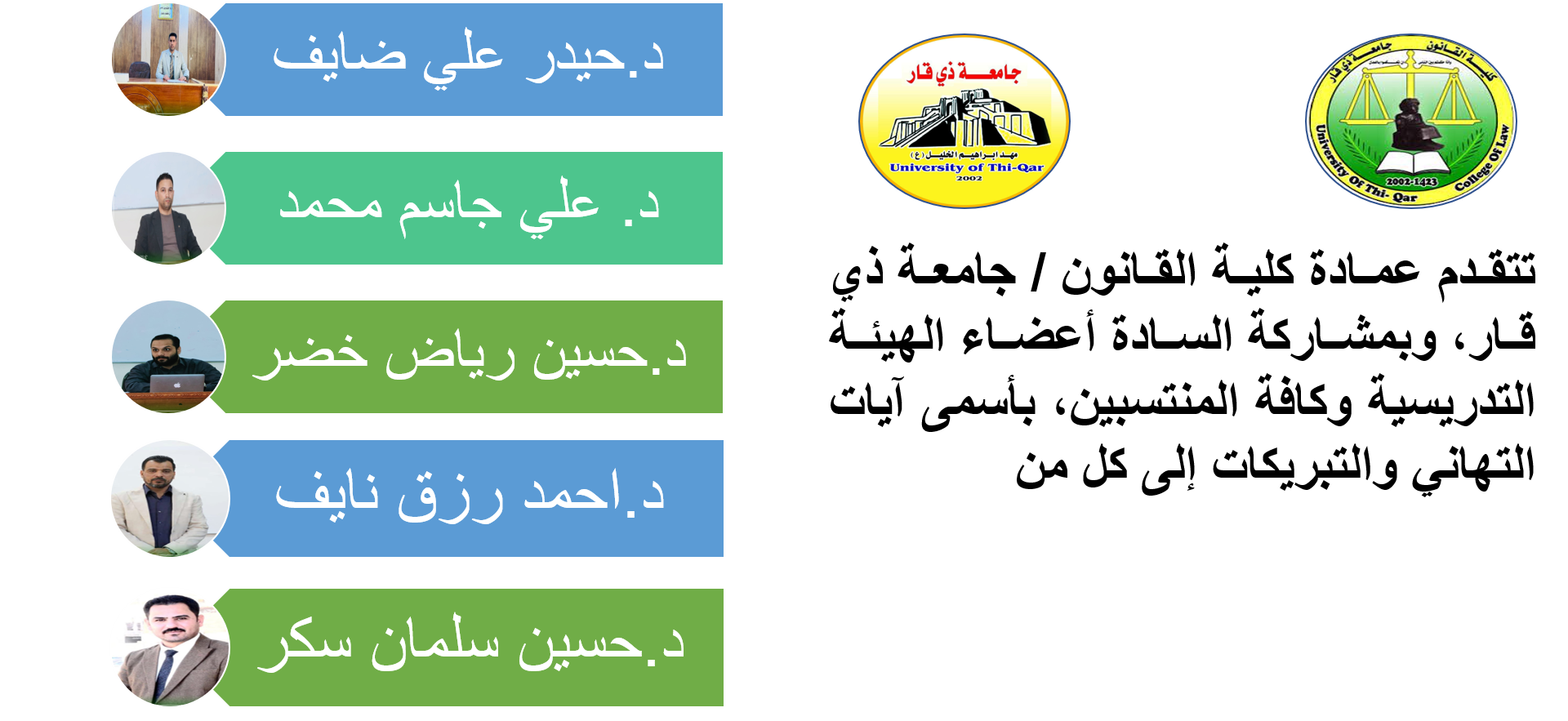 تتقدم عمادة كلية القانون / جامعة ذي قار، وبمشاركة السادة أعضاء الهيئة التدريسية وكافة المنتسبين، بأسمى آيات التهاني والتبريكات إلى كل من: الدكتور (علي جاسم محمد)، والدكتور (حيدر علي ضايف)، والدكتور (حسين رياض خضر)، والدكتور ( أحمد رزاق نايف)، والدكتور ( حسين سلمان سكر)، بمناسبة ترقيتهم العلمية إلى مرتبة (أستاذ مساعد)، في اختصاصاتهم القانونية، وذلك تتويجًا لجهودهم العلمية والأكاديمية المتميزة، وعطائهم الرصين في ميادين التدريس والبحث العلمي.